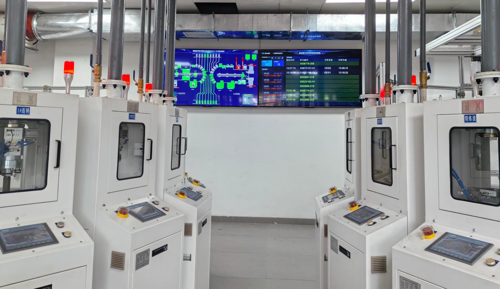 目前,實驗室已實現(xiàn)鐵、鋼樣品的全自動處理。樣品通過風動送樣系統(tǒng)送達后,工業(yè)機器人將自動完成抓取、輸送及分析前處理工序。核心控制系統(tǒng)(SPS)主界面集中呈現(xiàn)設備狀態(tài)與樣品流轉全過程,操作人員通過可視化界面可實時掌握運行實況。系統(tǒng)搭載智能調度功能,能依據(jù)爐前冶煉節(jié)奏動態(tài)調配制樣與檢測資源,顯著提升檢測效率。